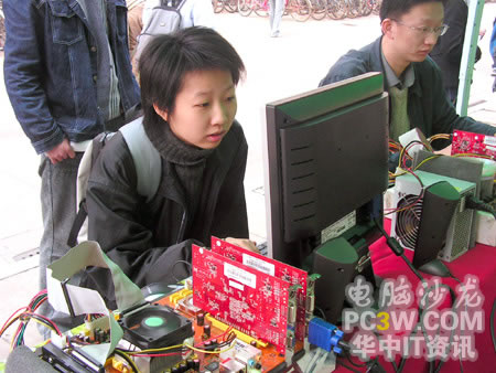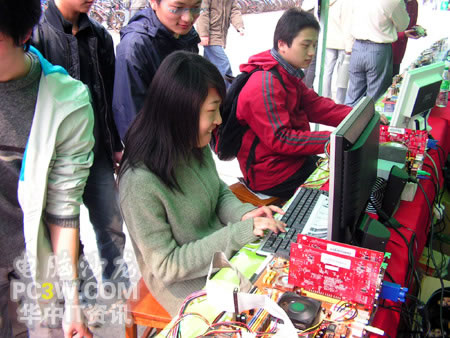 第一個進行SLI平臺體驗的竟然是一位MM,果然是巾幗不讓須眉啊。看她熟練的玩著極品飛車地下狂飆2,小編也不由感慨,這里不愧是華中地區最好的理工科學府啊,果真的臥虎藏龍。