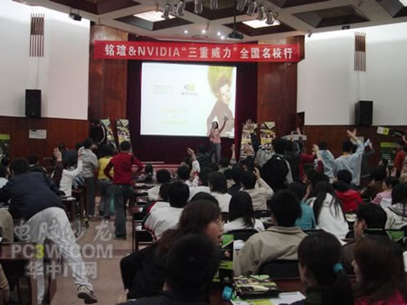 講座首先由商科集團武漢分公司天行電腦的甘松先生發言,他首先詳細的向大家解釋了銘瑄NVIDIA“三重威力”的定義。并就“三重威力”的具體內容SM3.0、HDR以及SLI逐一做了詳細的說明。他生動幽默的演講引來同學們的陣陣掌聲,會場氣氛相當融洽。