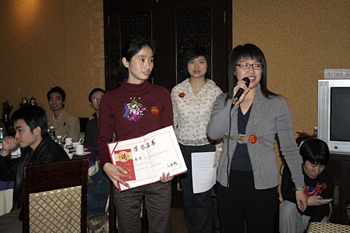 晚會開始前商科集團(tuán)領(lǐng)導(dǎo)對本年度表現(xiàn)優(yōu)秀的員工進(jìn)行了嘉獎和表彰他們是:第四季度部門之星:技術(shù)部 :敖亞軍、業(yè)務(wù)部:吳翠、市場部:臧永剛,第四季商科標(biāo)兵:財務(wù)部:羅春菊,第四季度銷售標(biāo)兵 :田勇,2006年度杰出員工:馮燕蘭,優(yōu)秀職能經(jīng)理 :楊毅,優(yōu)秀經(jīng)理 : 邵清泉