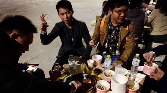 大家走了半天,終于到了午飯時(shí)間了,好菜可多啦,大家圍坐在一起,吃這頓豐盛的中午飯,有說有笑。
