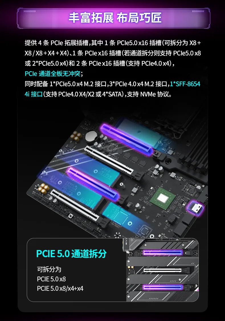 拓展方面,MS-iCraft Z890 Pacific提供前后置三Type-C,其中2個(gè)后置Type-C接口達(dá)到40G理論傳輸速度,數(shù)據(jù)傳輸速度進(jìn)一步升級(jí)!拓展方面,該主板提供4條PCIe拓展插槽,其中1條PCIe5.0 x16插槽可拆分為X8+X8/X8+X4+X4,PCIe通道全板無(wú)沖突,配備4個(gè)M.2硬盤接口和1個(gè)SFF-8654 4i接口(支持PCIe4.0 X4/X2或4*SATA)。
