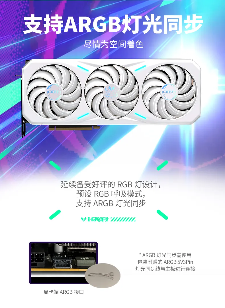 銘瑄GeForce RTX 4070 Ti SUPER iCraft ARGB OC16G璦珈顯卡延續備受好評的RGB燈設計,預設RGB呼吸模式,同時支持ARGB燈光同步,讓用戶無論是在激烈的游戲競技中,還是靜謐舒緩的學習創作中都能增添更多樂趣。