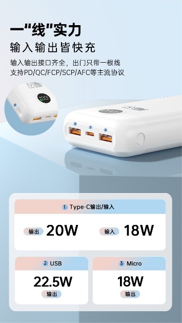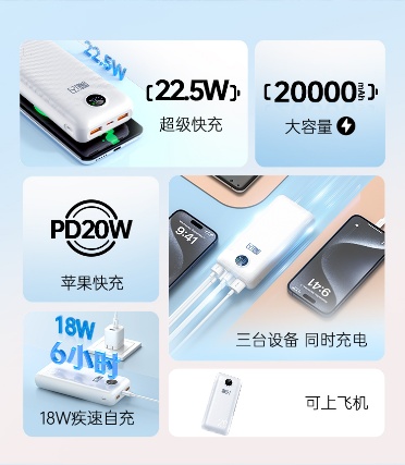 在接口設(shè)計方面,魔閃20充電寶展現(xiàn)了強大的兼容性和實用性。配備了2個USB接口和1個Type-C接口,能夠同時為多臺設(shè)備充電,滿足和家人、朋友的共同需求。無論是家庭聚會、朋友出行還是商務(wù)會議,魔閃20都能確保設(shè)備始終保持充足的電量。