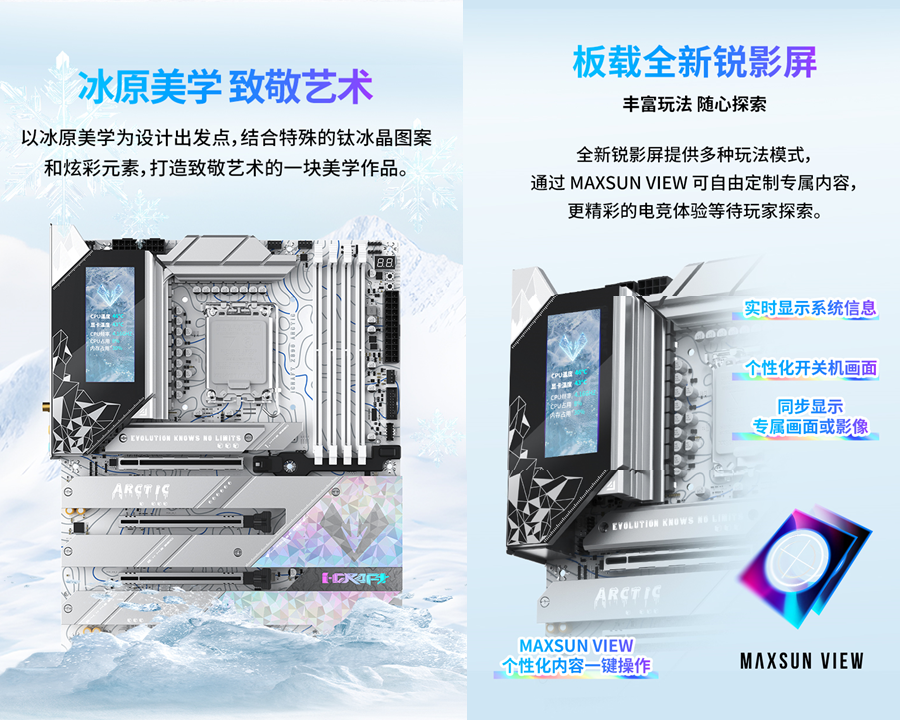 而要讓這顆 “強芯” 充分釋放潛能,離不開一塊實力與顏值兼備的主板 —— 銘瑄 iCraft Z890 Arctic 正是這樣的存在。這款主板作為iCraft系列的高端型號,以 “北冰洋” 為設計靈感,采用冰原美學設計。特殊的鈦冰晶圖案搭配炫彩元素,整體色調統一且富有質感,擺在機箱中宛如一件冰雕藝術品,完美適配當下流行的白色主機風格,與《戰地 6》的冰雪戰場形成奇妙呼應。