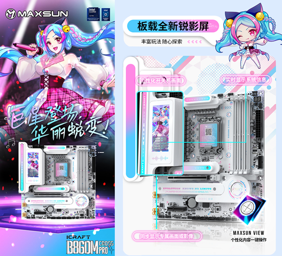 然后是銘瑄iCraft B860M CROSS PRO主板,作為顏值旗艦,全覆蓋著藍(lán)粉漸變的二次元紋路,每一處細(xì)節(jié)都透著精致感。吸睛亮點(diǎn)莫過(guò)于全新配備的3.4英寸銳影LED顯示屏,不僅能實(shí)時(shí)顯示CPU溫度、內(nèi)存頻率等系統(tǒng)信息,還能自定義開(kāi)關(guān)機(jī)畫(huà)面,甚至支持桌面映射,同步展示專屬壁紙或游戲畫(huà)面。搭配配套軟件MAXSUN View,玩家可以盡情解鎖無(wú)限自定義玩法,讓主板成為主機(jī)的 “個(gè)性門面”。