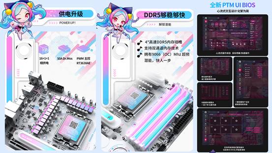 性能上這款主板同樣毫不妥協(xié)。16+1+1 相供電設(shè)計(jì)搭配核心供電 50A Dr.Mos,強(qiáng)悍的供電能力足以輕松駕馭英特爾酷睿Ultra 200S系列處理器的性能,即便在《戰(zhàn)地 6》滿負(fù)載運(yùn)行時(shí),也能保持穩(wěn)定輸出,避免因供電不足導(dǎo)致的卡頓、掉幀。4 條雙通道DIMM的DDR5內(nèi)存插槽經(jīng)過(guò)優(yōu)化線路布局,擁有 9066(OC)Mhz 的超頻潛能,玩家只需通過(guò)銘瑄 PTM UI 圖形化 BIOS,幾步簡(jiǎn)單操作就能調(diào)整供電參數(shù)、拉滿內(nèi)存頻率,輕松為《戰(zhàn)地6》優(yōu)化整機(jī)性能,小白也能輕松上手。