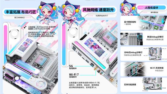 拓展性與網(wǎng)絡(luò)體驗(yàn)更是直擊玩家需求。該1條PCIe5.0 X16合金裝甲插槽+1條 PCIe4.0 X4 插槽,搭配3個(gè)滿速M(fèi).2硬盤接口和 4個(gè)6G SATA接口,無(wú)論是加裝高速固態(tài)硬盤還是拓展其他硬件,都能從容應(yīng)對(duì)。多人對(duì)戰(zhàn)時(shí)就怕網(wǎng)絡(luò)卡頓,這款主板搭載英特爾BE200無(wú)線網(wǎng)卡,支持Wi-Fi 7 和藍(lán)牙5.4,再加上5G有線網(wǎng)口的雙旗艦網(wǎng)絡(luò)配置,傳輸速度又快又穩(wěn),讓你在《戰(zhàn)地6》的百人對(duì)戰(zhàn)中告別延遲,快速響應(yīng)每一次戰(zhàn)術(shù)指令。更貼心的是,顯卡瞬拆結(jié)構(gòu)和 Wi-Fi天線快裝設(shè)計(jì)讓裝機(jī)、升級(jí)更便捷,數(shù)顯+分布式 Debug 診斷燈能一眼識(shí)別故障位置,省去繁瑣排查步驟,讓玩家專注享受裝機(jī)與游戲的樂(lè)趣。