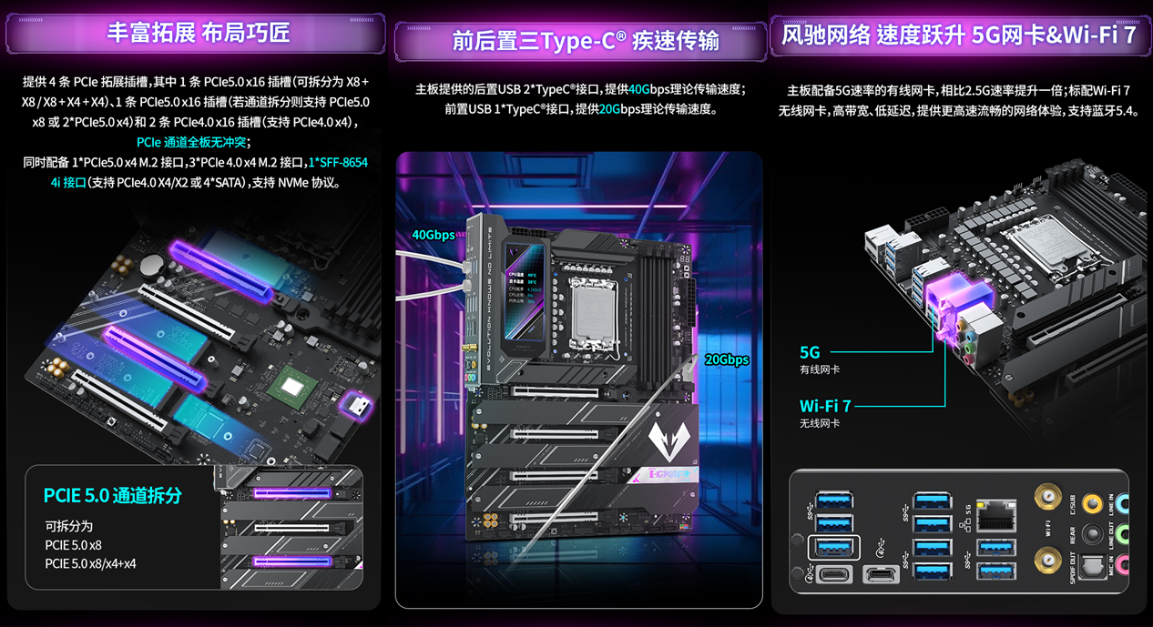 擴(kuò)展方面也十分出色,該主板提供4條PCle拓展插槽,其中1條PCIe 5.0 x16插槽支持靈活拆分,可根據(jù)需求調(diào)整為X8+X8 或X8+X4+X4模式,滿足同時搭載高性能顯卡與PCIe擴(kuò)展卡的需求;板載的SFF-8654 4i接口,可靈活擴(kuò)展為PCIe 4.0 x4通道或4個 SATA 接口,適配多設(shè)備存儲方案。I/O區(qū)域的兩個40Gbps速率USB4 Type-C 接口,配合DP 1.4與HDMI 2.1視頻接口,輕松滿足多設(shè)備連接需求。網(wǎng)絡(luò)體驗同樣無需擔(dān)憂,該主板搭載 Intel BE200 無線網(wǎng)卡與 Realtek RTL8126 有線網(wǎng)卡,支持 Wi-Fi 7 與 5G 有線網(wǎng)絡(luò),還具備藍(lán)牙 5.4 功能。無論是在復(fù)雜網(wǎng)絡(luò)環(huán)境下進(jìn)行聯(lián)機(jī)對戰(zhàn),還是連接無線外設(shè),都能實現(xiàn)低延遲、高穩(wěn)定的傳輸,讓你避免因網(wǎng)絡(luò)波動錯失戰(zhàn)機(jī)。